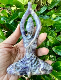 Embrace the calming and mystical energy of the Dream Amethyst Yoga Goddess Sculpture, a powerful symbol of balance, intuition, and inner peace. This handcrafted piece merges the divine feminine with the soothing vibrations of dream amethyst, also known as chevron amethyst. With its mesmerizing bands of purple and white, this stone is believed to enhance spiritual awareness, clarity, and emotional healing.